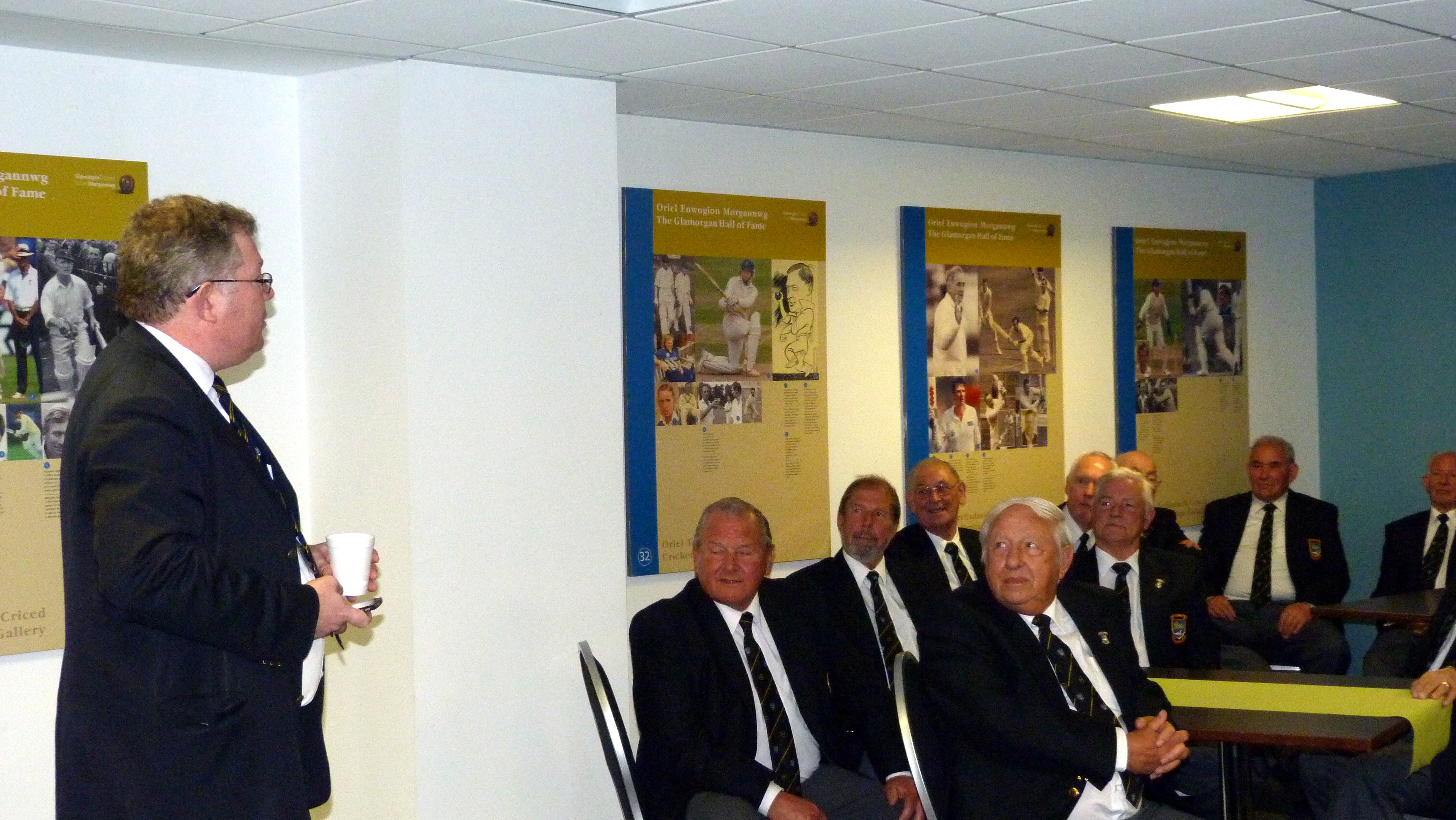 Gathered together in the wonderful hospitality restaurant we were treated to warming tea and coffee prior to braving the elements, while listening to a history of Glamorgan’s cricket greats given by Andrew Hignell. Memories of Glamorgan Cricket legends such as Wilf Wooller, captain of the 1948 championship winning side, Tony Lewis and Matthew Maynard who led Glamorgan to Championship wins in 1969 and 1997 respectively and not forgetting Maurice Turnbull, Emrys and Dai Davies, and Robert Croft (this is his testimonial year) among many others. A major honour and highlight for the new stadium was the hosting in 2009 of the first ever Ashes game of England v Australia to be held in Wales when England held out for two days for a magnificent, enthralling draw against all the odds.