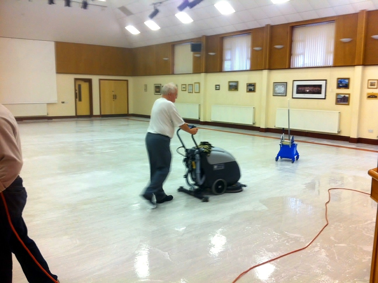 With expertise, equipment and chemicals supplied by 2nd Tenor Mike Thurman the group of Mike, baritones Dai Kirton, Theo Roberts, Leon Jones and bass chorister Dave Scott worked like Trojans over the 3 days of the Bank Holiday weekend to move all the tables, chairs, piano and staging out of the hall. They chemically stripped the old surface away and applied a new coating to achieve a fantastic polished result before putting everything back in place.  This was a tremendous achievement to give the choir hall a much needed uplift before the visit of our Gala Concert guests, Bridgend Male Choir on September 8th.  Well done, lads.