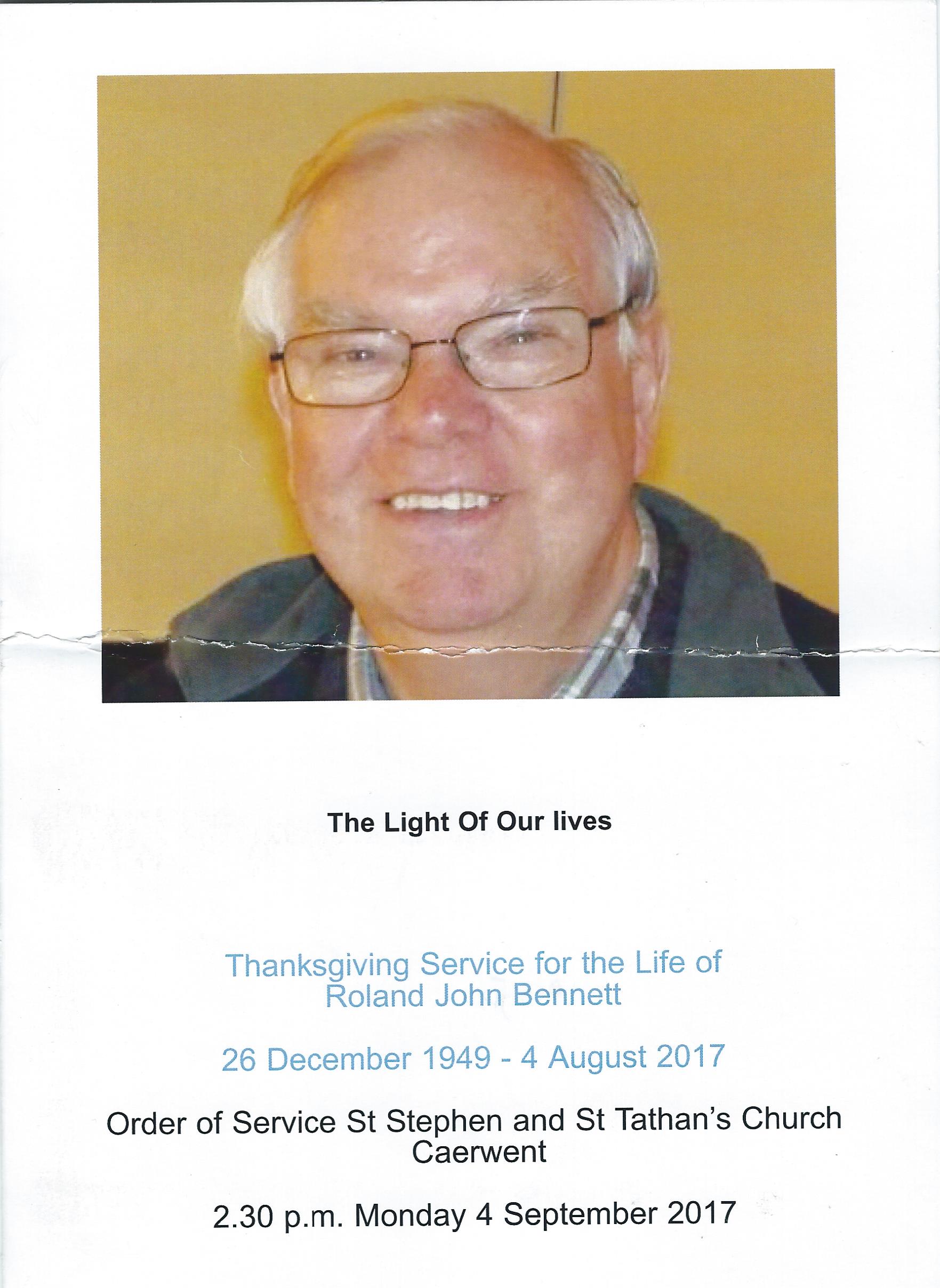 The Choir was saddened but proud and privileged to be part of the Memorial Service to tenor chorister Roley Bennett at the small, local St Stephen and St Tathan Church in Caerwent on Monday 4th September following his sudden death on August 7th reported earlier.
