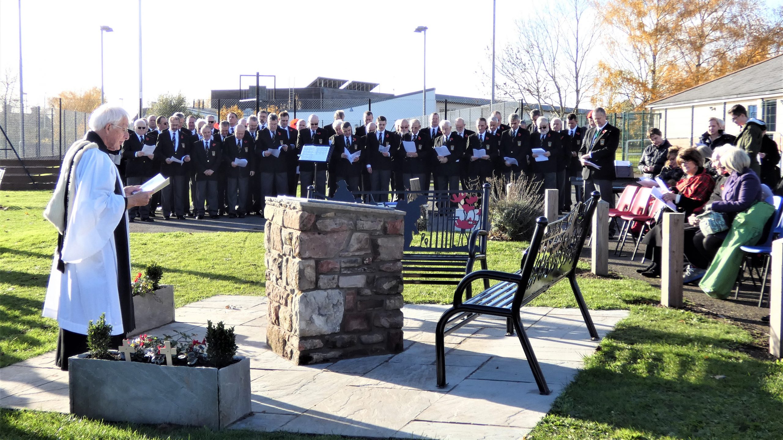In October 2018 Caldicot Male Voice Choir was honoured and privileged to be invited to sing ‘Mansions of the Lord’ at the inauguration and dedication of the new War Memorial in Rogiet Recreational field. The Choir was conducted by Shirley Anne James and accompanied by John Nicholson. The service of dedication was conducted by Rev. Glyndwr Hackett.