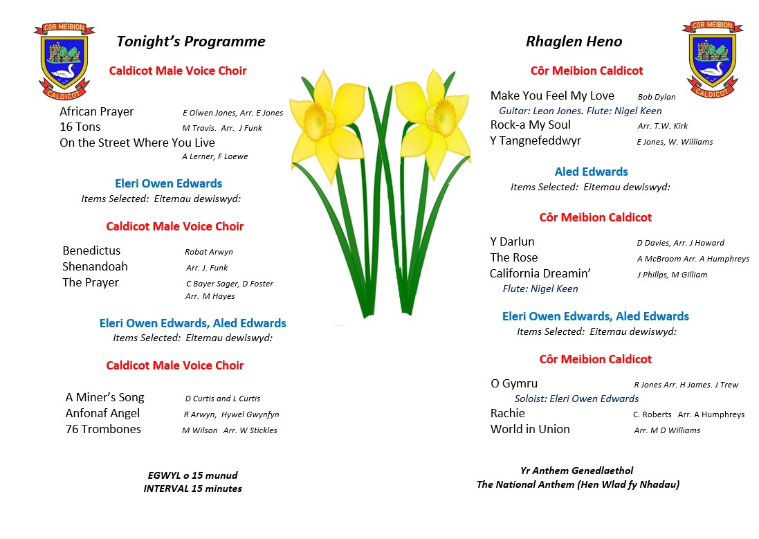 Among the Choir’s invited guests were Jessica Morden MP a long standing supporter of the Choir and along with Caldicot’s Monmouthshire County Councillors, Mat Feakins the chairman of Monmouthshire County Council. Guest artistes were the talented, award winning husband and wife duo from Llandovery ; Eleri Owen Edwards and husband Aled who performed numerous pieces from the world of opera and musicals.