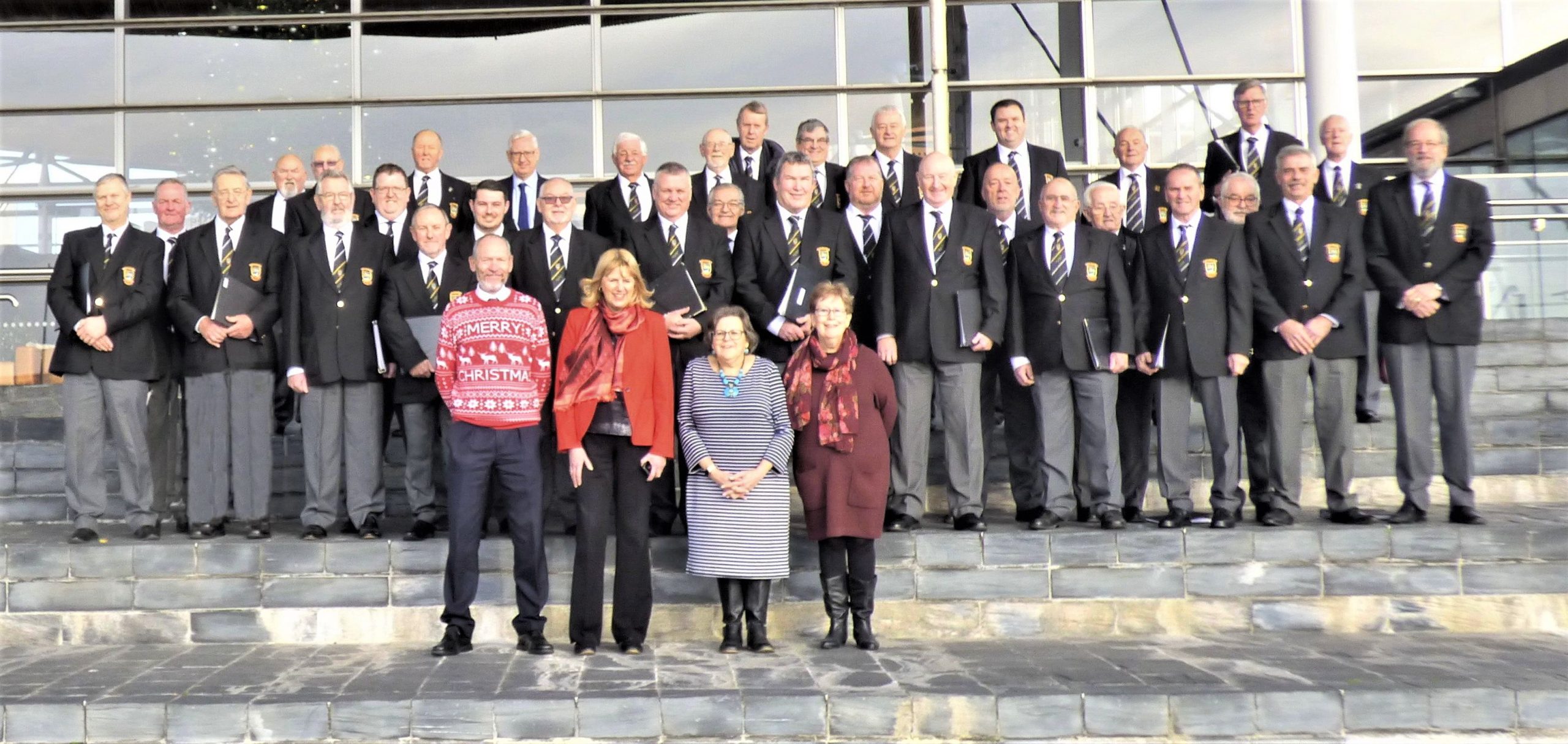 The choir descended the open staircase to assemble on the stage where John Griffiths MS gave an appreciated presentation of his association with the choir and a short history and description of some of the Choir’s achievements.